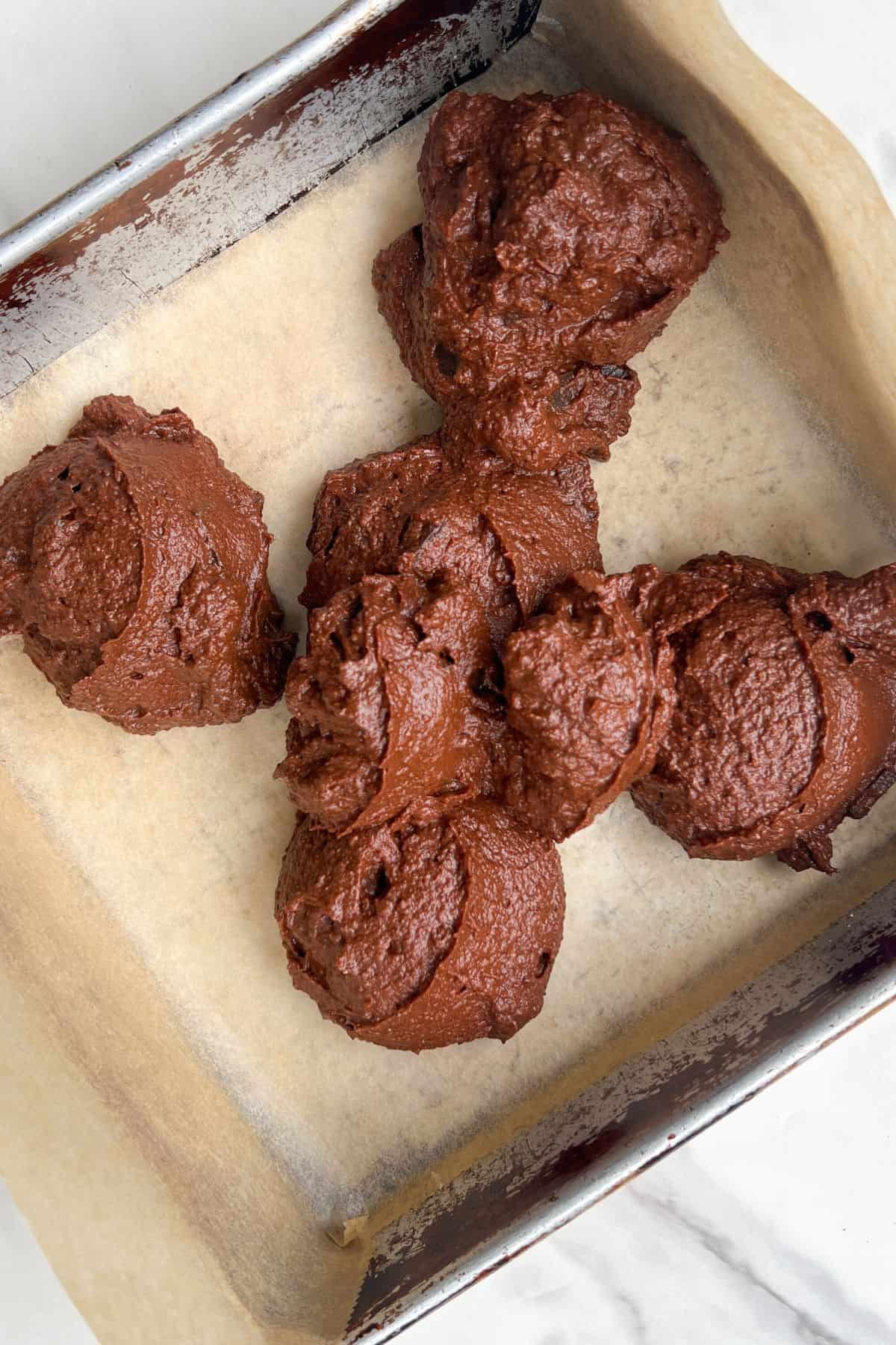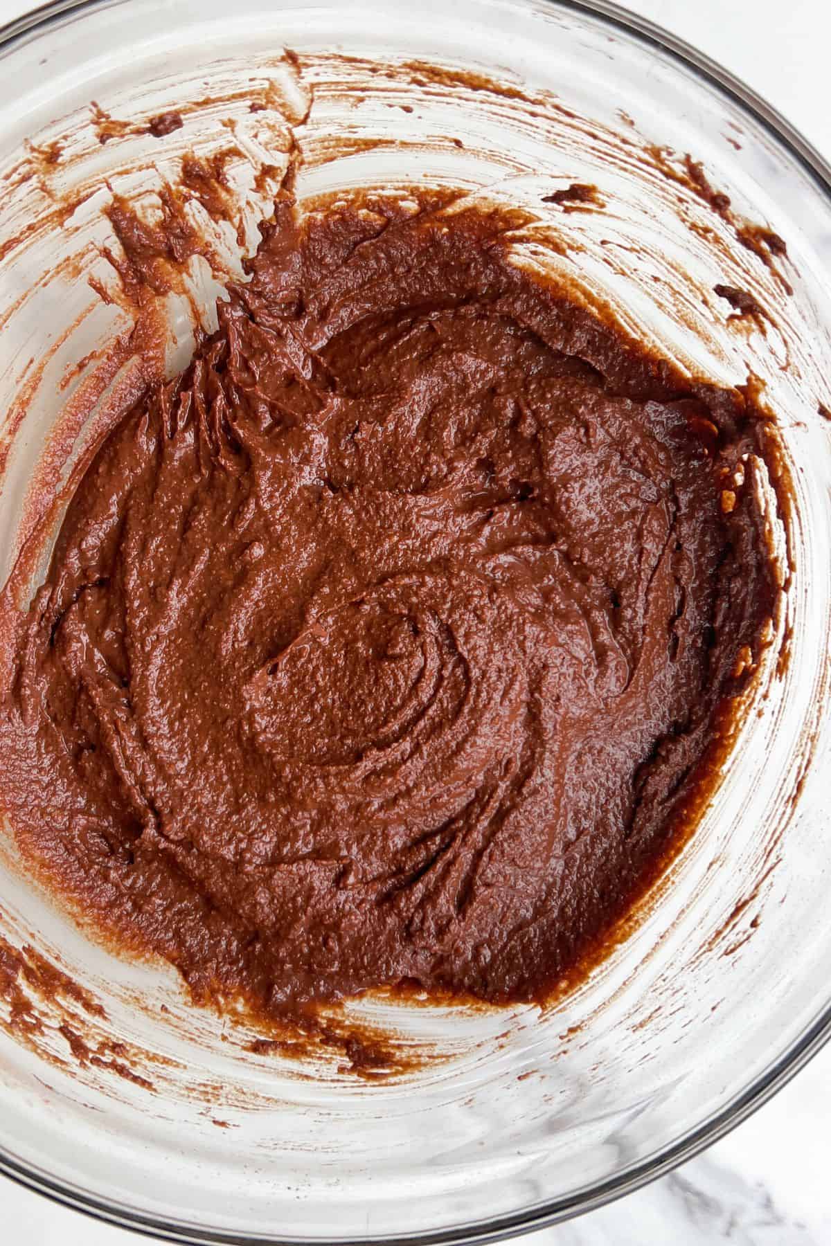 - Once fully combined, add in the almond flour, unsweetened cacao powder, baking soda and baking powder. Mix until combined