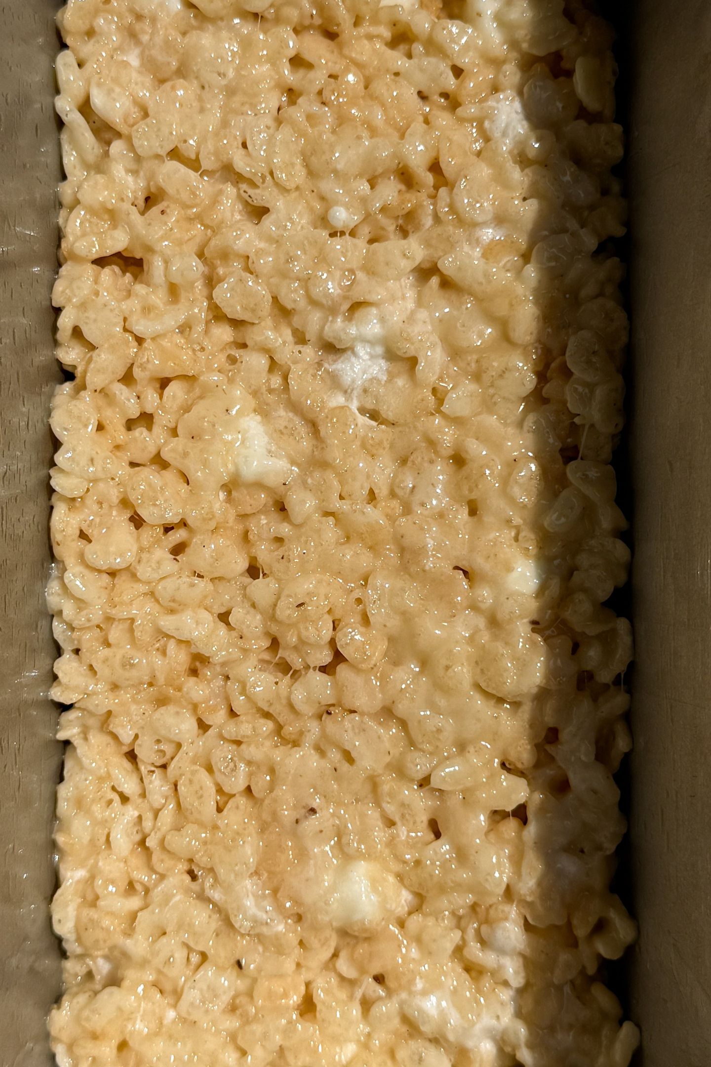 - Spray a spatula with nonstick spray then gently press it down into an even layer (the nonstick spray prevents it from sticking to the cereal treats)