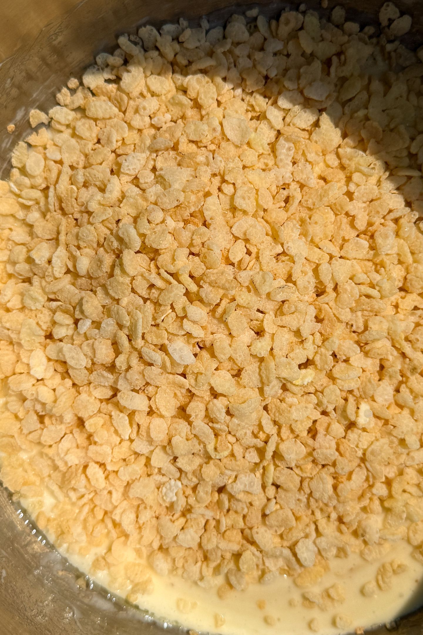 - Add in the crispy rice cereal and remaining amount of the mini marshmallows