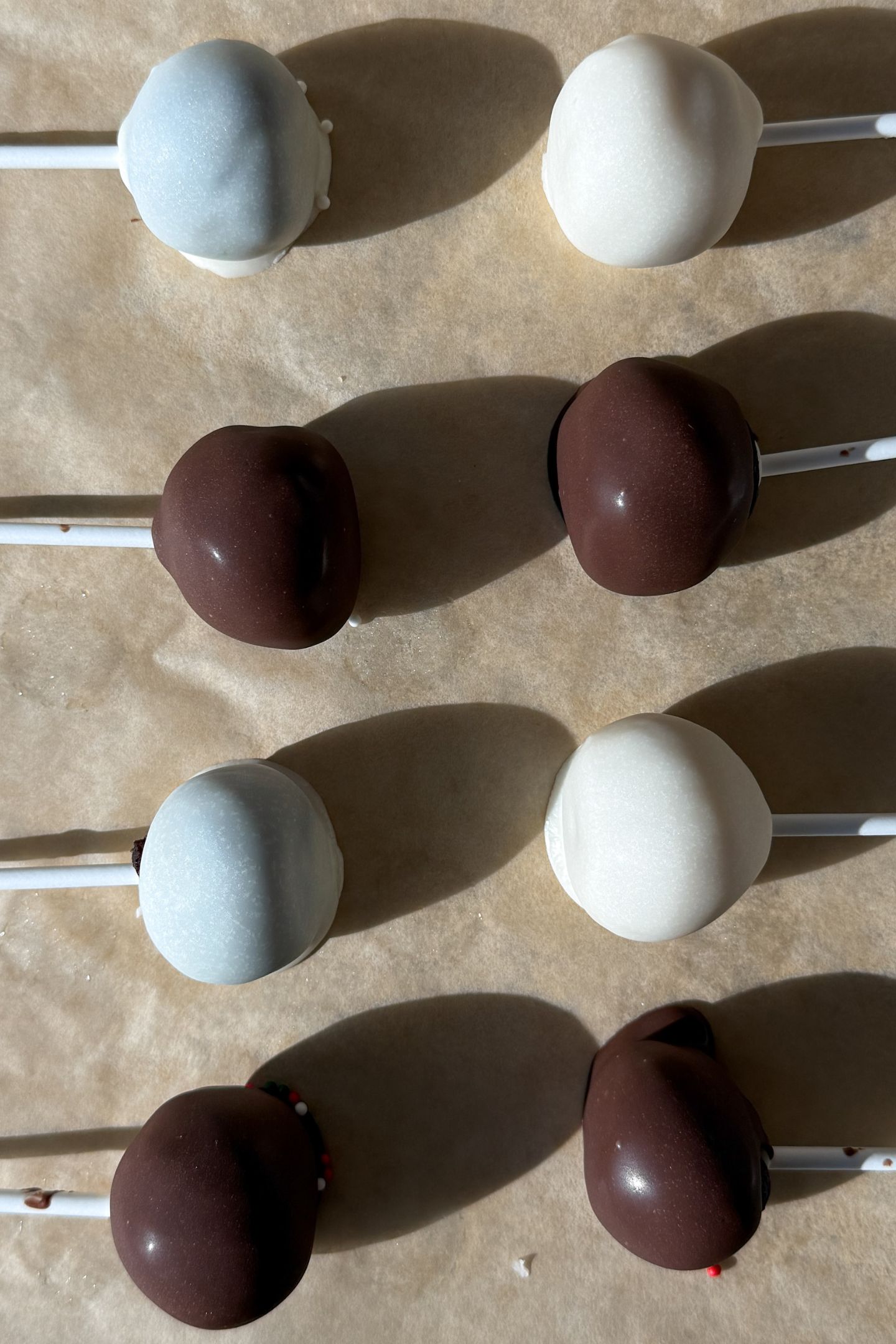 - Dip the end of a cake pop stick into the melted chocolate then into the cake pop ball. Place back on the parchment paper