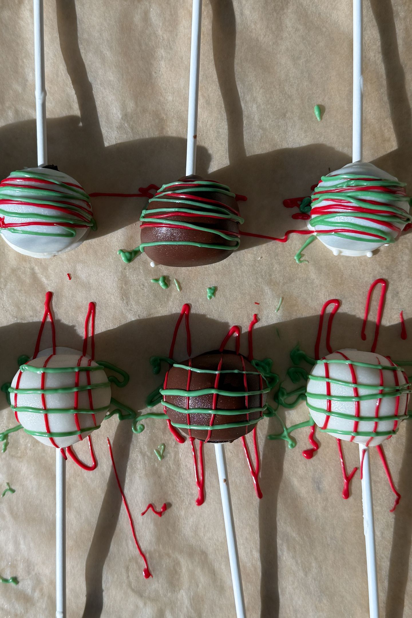- If decorating with colored chocolate wafers, let the coating set completely. Once set, drizzle on the decorative chocolate (I like to added the melted chocolate to piping bags for drizzling it on)