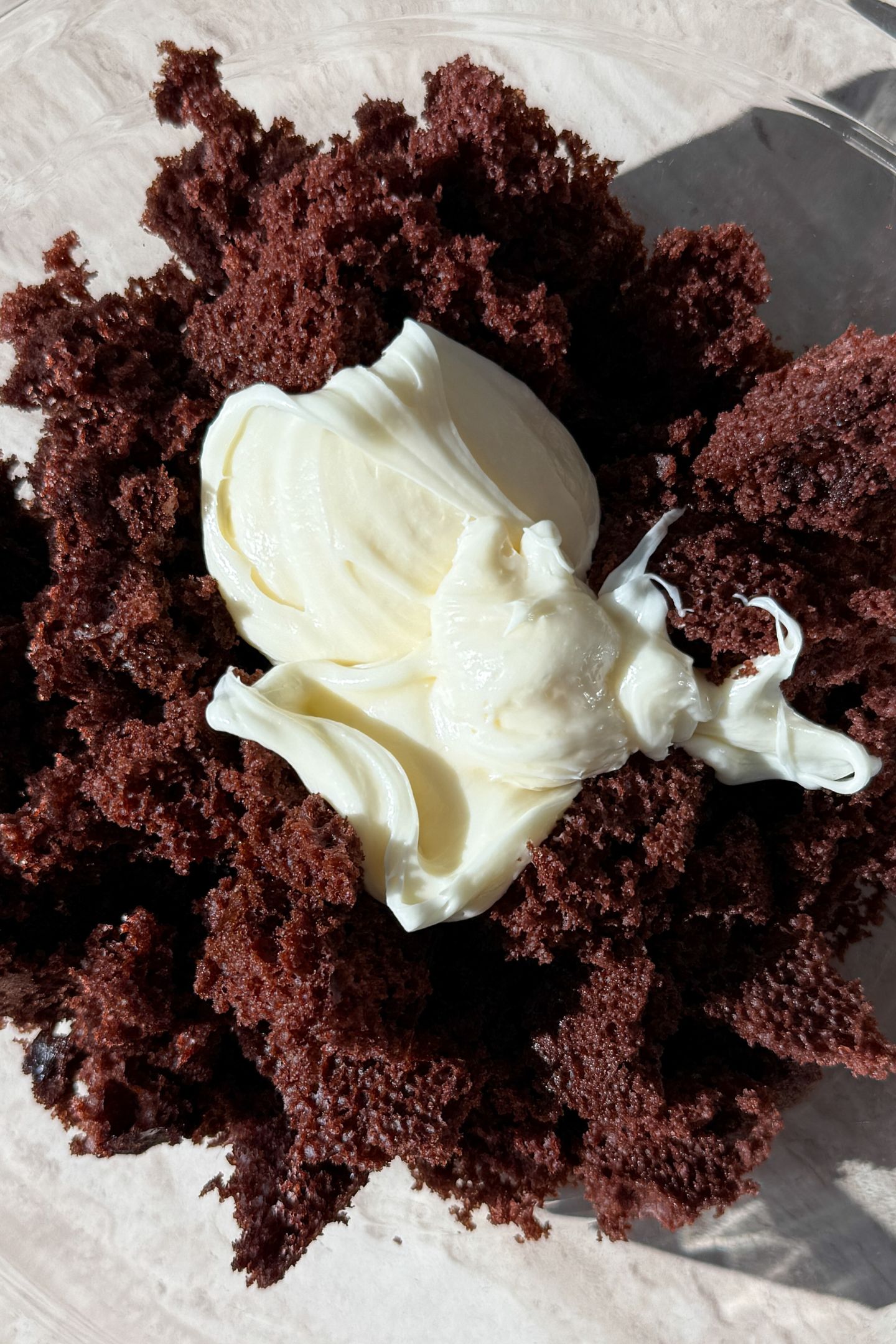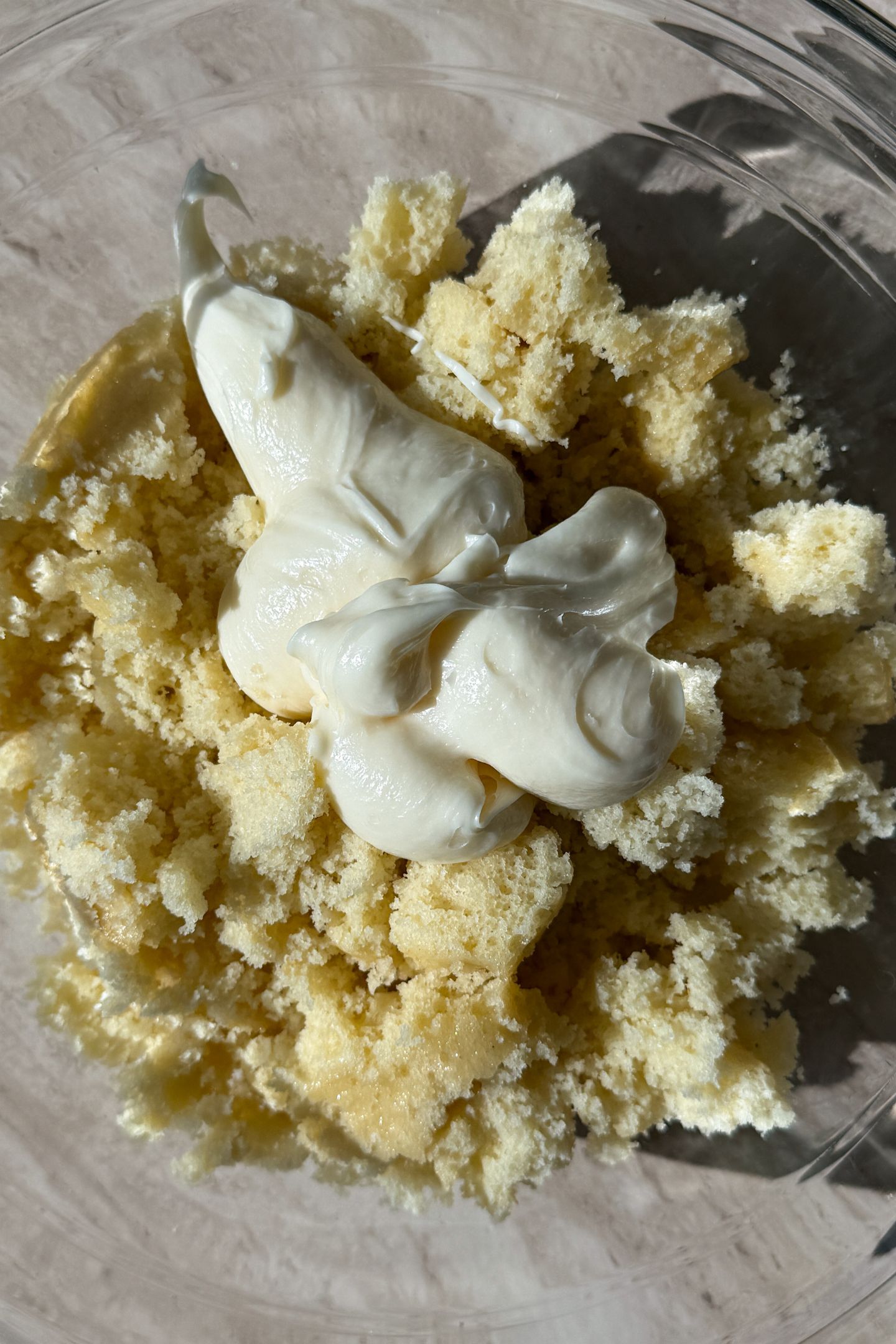 - Crumble the cooled cake into a large mixing bowl